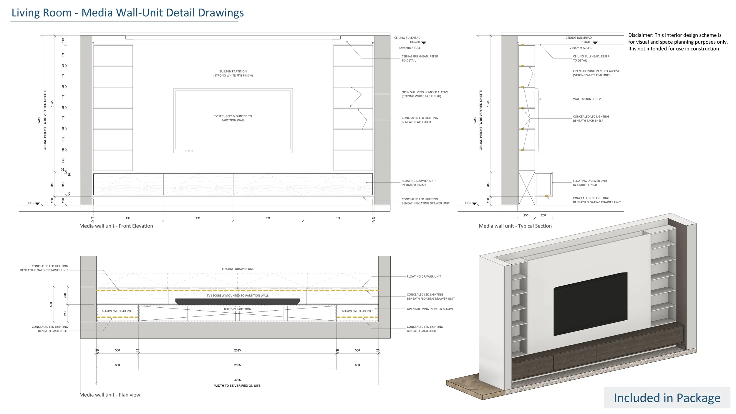 Our room elevations provide detailed, flat-view representations of your space's walls, showcasing key features such as windows, doors, and wall finishes. These elevations offer a clear view of the vertical layout, helping you visualise how various design elements will fit together within the overall design.